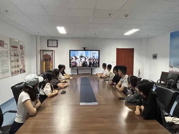 大屏幕前,大家神情肃穆,认真聆听习近平总书记重要讲话,观看祖国威武之师、和平之师的雄壮行进,现场氛围庄严而热烈,共同见证了这一展现国家国防力量和民族凝聚力的庄严时刻。